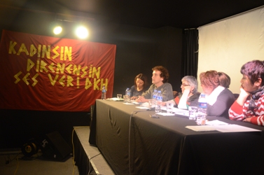 İSTANBUL (30.11.2014)-DKH, 25 Kasım Kadına Yönelik Şiddete Karşı Uluslar arası Dayanışma ve Mücadele Günü kapsamında bugün saat 15.00’de Yüz Çiçek Açsın Kültür Merkezi’nde panel düzenledi. ‘Kadınsın, direnensin, ses ver!’ şiarıyla başlatılan 25 Kasım çalışmaları da bugün yapılan panelle noktalandı. Panele konuşmacı olarak İstanbul LGBTİ Dayanışma Derneği üyesi Kıvılcım Arat, Ev İşçileri Dayanışma Sendikası Genel Başkanı Gülhan Benli, Eski Mahpuslar ve Wernicke Korsakofflularla Dayanışma Girişimi üyesi Seza Mis Horuz, İHD Cezaevi Komisyonu üyesi Hatice Onaran ve DKH Temsilcisi katıldı. Panel Bernaların, Barbaraların, Mirabel Kardeşlerin, Deniz Fıratların, Kader Ortakayaların ve Arin Mirxanların şahsında tüm devrim ve komünizm şehitleri adına yapılan bir dakikalık saygı duruşu ile başladı. Saygı duruşunun ardından DKH tarafından hazırlanan sinevizyon gösterimi izlendi.