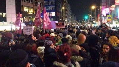 İSTANBUL (15.02.2015)- Dün saat 19.00’da Kadın Cinayetlerine Karşı Acil Önlem Grubu’nun çağrısıyla Kadıköy Boğa Heykeli’nde bir araya gelen binlerce kadın, caddeyi trafiğe kapatarak Rıhtım’a yürüdü. Yürüyüşte erkek egemenliğine ve AKP iktidarına yönelik tepki yansıtılırken, kadın katliamlarının politik olduğuna dair vurgularla kadın mücadelesinin yöntemine ilişkin dövizler taşındı. Yürüyüş sırasında “Özgecan Aslan ölümsüzdür” , “Özgecan’ın hesabı sorulacak” , “Erkek vuruyor devlet koruyor” sloganlar atıldı.