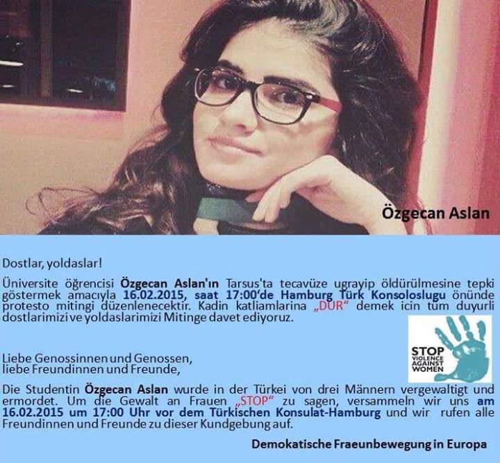 Üniversite öğrencisi Özgecan Aslan’ın Tarsus’da tecavüze uğrayıp öldürülmesine tepkimizi göstermek amacıyla 16/02/2015 Pazartesi günü saat 17.00’de Hamburg Türk Konsolosluğu önünde protesto mitingine tüm halkımızı çağırıyoruz.