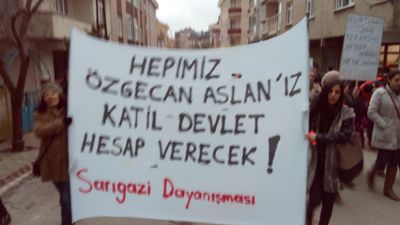 Kitle saat 17.00’da Cem evi önünde toplanarak Demokrasi Caddesi’ne doğru yürüyüşe geçti. Demokrasi Caddesi’nden merkeze yürüyen kitle, “Kadın erkek el ele sosyalist devrime”, “Kurtuluş yok tek başına ya hep beraber ya hiç birimiz”, “Katil devlet hesap verecek”, “Özgecan Aslan ölümsüzdür” sloganları attı. Eyleme destek veren Sarıgazi esnafları kepenk kapattılar.