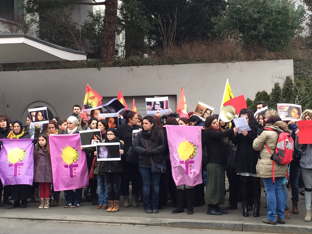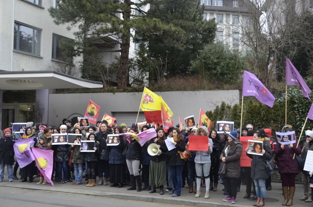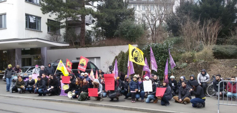 Avrupa Demokratik Kadın Hareketi, Yeni Kadın ve Zürih Kürt Kadın Hareketi’nin örgütlediği eylemde polisin konsolosluk önünü demir barikatlarla sarıp demirlerin arasında açıklama yapılmasına müsaade edeceklerini söylemesi üzerine, kitle tepkisini geliştirerek barikatları kaldırdı.Kısa bir gerginliğin ardından açıklama başladı.”Yasta Değil İsyandayız” şiarıyla yapılan eylemde okunan basın metninde: