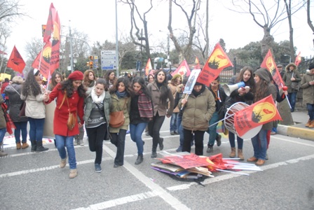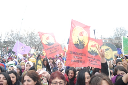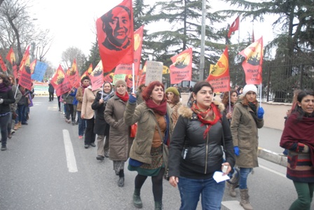 İSTANBUL (08.03.2015)- Kadıköy Numune Hastanesi önünde saat 12.00’de toplanan binlerce kadın; pankartlar, flamalar ve dövizler eşliğinde yürüyüşe geçti. Platform içerisinde yer alan Demokratik Kadın Hareketi (DKH) de kadının rengini slogan ve dövizleriyle alanlara taşıdı. ‘Kadınım Kendi Savaşımın Savaşçısıyım’ yazılı pankart arkasında toplanan DKH eylem boyunca ‘Kadın katliamları politiktir’, ‘Kadınlar sokağa özgürleşmeye’, ‘Bedenimiz emeğimiz kimliğimiz bizimdir’, ‘Jin jiyan azadi’, ‘Kadınlara özgürlük sosyalist halk savaşıyla gelecek’, ‘Eşit işe eşit ücret’ sloganları attı. ‘Kadın ve trans katliamları politiktir’, ‘Devletin istihdam paketi katliamdır’, ‘T.C.avüzcü devlet yıkacağız elbet’, ‘Kürtaj haktır karar kadınların’ dövizleri taşıyan DKH, Berna Saygılı, Meral Yakar, Barbara Anna Kistler, Arin Mirxan gibi devrim mücadelesinde şehit düşmüş kadınların fotoğraflarını taşıdı.