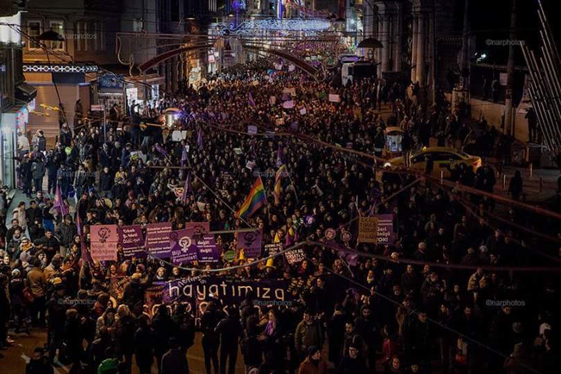 İstanbul Feminist Kolektif çağrıyla Taksim’de 13 Feminist Gece yürüyüşünü gerçekleştiren binlerce kadın, her gün 3 kadın katleden erkek ve devlet şiddetini protesto etti. Kadınlar Fransız Konsolosluğu’ndan Tünel Meydanı’na kadar yürüdü. İstiklal Caddesi mora boyayan binlerce kadınlar, AKP’nin kadın düşmanı politikasına , “Hayatımdan elini çek” diyerek karşılık verdi.