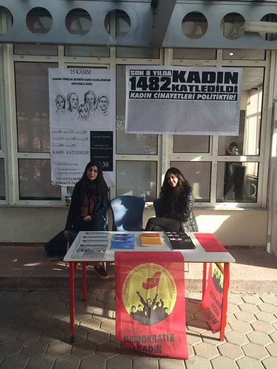 Demokratik Kadın Hareketi Eskişehir Örgütlülüğü, Anadolu Üniversitesi Yunus Emre Kampüsü Yemekhanesi önünde ve Osmangazi Üniversitesi Meşelik Cafede 25 Kasım “Kadına Yönelik Şiddete Karşı Uluslar arası Mücadele Günü” için stant, ozalit ve çağrı bildirisi çalışması yaparak sınıfsal, ulusal, cinsel sömürüye, tecavüz ve tacize, fuhuş sektörüne karşı 25 Kasım Çarşamba Günü saat 15:30’da Üniversite Caddesi Espark Önünden başlayacak olan sessiz yürüyüşe Demokratik Kadın Hareketi saflarına çağrıda bulundu.