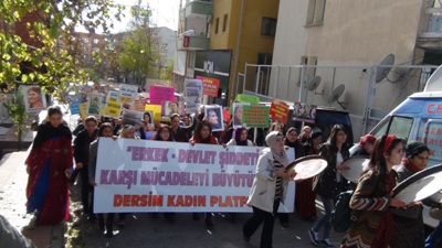 Dersim’de Demokratik Kadın Hareketi’nin de örgütleyicisi olduğu Dersim Kadın Platformunun çağrısıyla sanat sokağında “erkek-devlet şiddetine karşı mücadeleyi büyütüyoruz” pankartı arkasında bir araya gelen kadınlar 25 Kasım kadına yönelik şiddete karşı uluslar arası mücadele gününde erkek egemen sisteme karşı alanları doldurdu