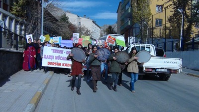 DERSİM (25.11.2015)- Dersim Kadın platformu 25 Kasım çalışmaları kapsamında bugün kitlesel bir yürüyüş gerçekleştirerek erkek egemen gerici zihniyete karşı mücadeleyi büyütme çağrısı yaptı. Saat 12.00 ‘de Sanat sokağında Erbaneler eşliğinde başlayan yürüyüş Okullar caddesinden palavra meydanında bulunan insan hakları evrensel bildirgesi anıtı önüne kadar yürüyüş gerçekleştirildi. Yürüyüş boyunca “ erkek vuruyor devlet koruyor”, “ Ekin Wan ölümsüzdür”, “jin jiyan azadi”, “Trans cinayetleri politiktir”sloganları atıldı.