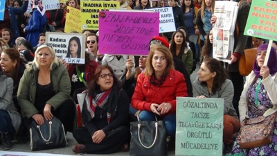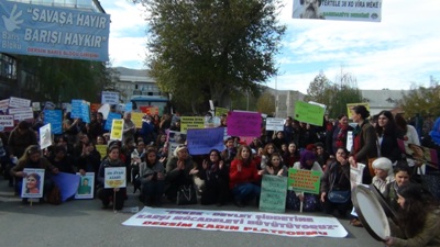 Mirabel Kardeşler sahsında devrim şehitleri için bir dakikalık saygı duruşunun ardından beş dakikalık oturma eylemi yapan kadınlar, oturma eyleminin ardından kadın platformu adına basın açıklaması okundu. Okunan açıklamada; ‘’Bize bu günü miras bırakan Mirabel Kardeşler, 1930’dan 1961’e kadar Dominik Cumhuriyetini Yöneten diktatör Turujillo Yönetimine karşı insan hakları ve demokrasi için mücadelede simgeleşen kadınlardır. Askeri faşist darbe ile başa gelen Turujillo yönetimine karşı mücadele eden Mirabel Kardeşler, Turujillo tarafından terörist ilan edilmiş, ‘ülkenin bütünlüğüne zarar verdikleri’ gibi beyanlarla hedef haline getirilmesinden bir ay geçmeden de, 25 Kasım tarihinde, tecavüze uğrayarak katledilmişlerdir. O günden bu yana kadınlar mücadelelerinin öfkesini her 25 Kasımlarda sokaklara döküyorlar! Cinsiyet eşitsizliğine, ayrımcılığa, ataerkil şiddete, savaşa, ırkçılığa ve milliyetçiliğe karşı kadın dayanışmasını örüyor, seslerini yükseltiyorlar. Ve bugün de Kelebekler bütün Dünya Kadınlarına kanat oluyorlar. Yıllar değişiyor, ancak dünyadaki erkek egemen sistemler varlığını koruduğu için, ülkenin adı değişiyor, araçlar çağa uyarlanıyor ama kadına yönelik şiddet ve sömürü düzeni değişmiyor. Dominik Cumhuriyetinde muhalif sesler faili meçhulle katledilirken, bugün faili meçhullerin yerini faili ortada olan, beslenip büyütülüp mazlum halkların üzerine salınan IŞİD vari terör örgütleri eli ile yapılan katliamlar alıyor. Son örneğini Ankara’da olmak üzere, daha önce Suruç’ta ve Amed’de de yaşadığımız katliamlarda kadınlarımız katledildi! Yetmedi, ülkeyi iktidarları için yangın yerine çevirdiler. “400 vekil alsaydık bütün bunlar yaşanmazdı” sözleri ile iktidarları için büyüttükleri savaşı da ayan beyan ortaya koydular. Ama biz kadınlar ne Barış için katledilenleri unutacağız ne de Barış mücadelemizden vazgeçeceğiz! Biz kazanacağız. Sevgili kadınlar, Varto’da sokağa atılan sadece Ekin Wan’ın çırılçıplak bedeni değildi, Varto’da sokağa atılmak istenen direnen kadının onuru, bedeni ve mücadelesiydi! Ekin Wan bize bir kez daha hatırlattı, savaşın kadın bedeni üzerinden yürütülen kirli yüzünü!”