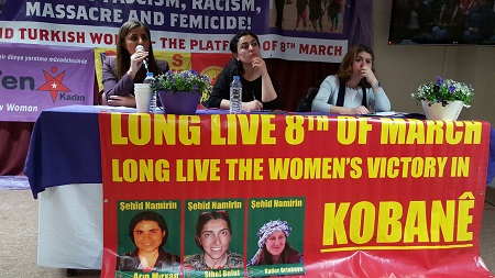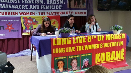 LONDRA( 13.03.2016) Londra’da kurulan ve ADKH, Roj Kadın, Yeni Kadın, SKB, Kırkısraklılar Kadın Komitesi, Dersim Derneği Kadın Komitesi, Alkaslar Derneği Kadın Komitesi’nin yer aldığı Kürdistanlı ve Türkiyeli Kadınlar-8 Mart Platformu aldığı bir dizi eylem kararı aldı. Bunlardan ilki 5 Mart günü düzenlenen enternasyonal 8 Mart yürüyüşüne katılmaktı. Platform ortak pankartıyla bu yürüyüşte yerini alarak bugün Kürdistan’da yaşanan katliamlara değinerek güzergah boyunca kamuoyunun dikkatini çekmeyi başardı.