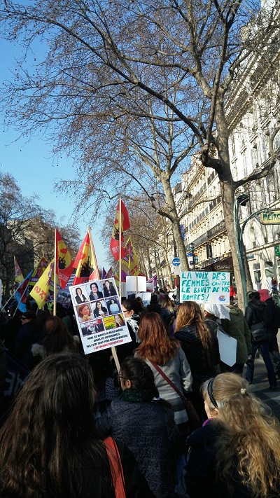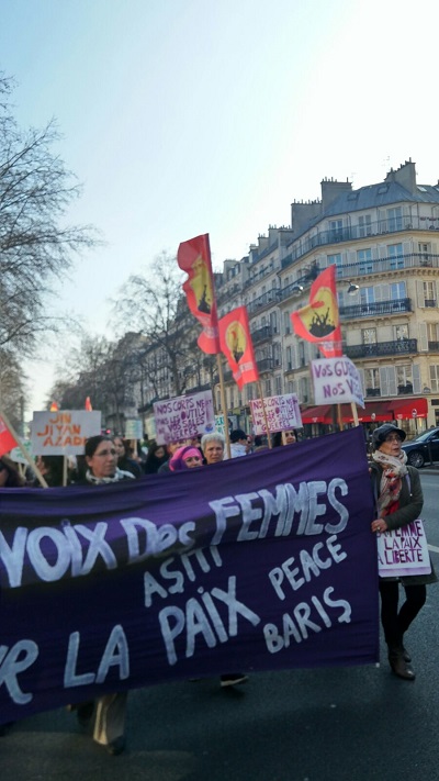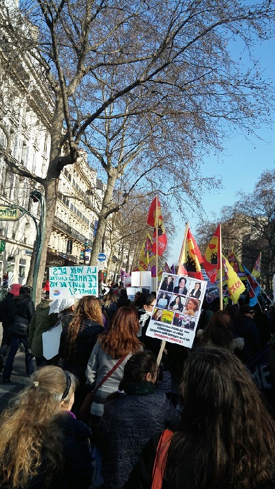 PARİS (13.03.2016) Avrupa Demokratik Kadın Hareketi bugün yapılacak yürüyüş öncesi bir kahvaltı düzenleyerek kadınlarla bir araya geldi. Kahvaltı sırasında sinevizyon gösterimi yapıldı ve günün önemine dair konuşmalar yapıldı. Sonrasında yürüyüş alanına gidildi. Kadın platformunun ortak düzenlediği yürüyüş Bastille’de başladı ve Republic Meydanında bitti. sloganlar ve halaylar eşliğinde yürüyen kadınlar meydana geldiklerinde kurumlar adına konuşmalar yapıldı. ADKH’nın da konuşma yaptığı yürüyüş sırasında DKH ve ADKH’nın ortak çıkardığı bildiri Fransızca ve Türkçe olarak dağıtıldı.