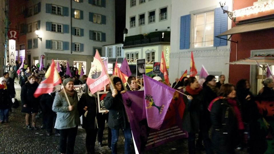ZÜRİH(26.11.2016)- 25 Kasım Uluslararası kadına yönelik şiddete Karşı Mücadele günü vesilesiyle Zürih’te Avrupa Demokratik Kadın Hareketinin de içinde yer aldığı yüzlerce kadının katılımıyla bir yürüyüş gerçekleştirildi. 25 Kasım Cuma günü saat 19.00’da, Zürih Kunst Haus önünde başlayan ve Langstrasse ‘de sonlandırılan yürüyüş programı içinde 8 ayrı noktada durularak her kadın hareketi kendi mesajasını Almanca- Türkçe sundu. Avrupa Demokratik Kadın Hareketi, Mulhaous ADKH’nin de katılımı ile, Yeni Kadın, Beritan Kadın Meclisi, Aufbau Frauenstruktur, FrauenLesbenKasama, Frauen Lora, Frauen Kafi in der RAF Kochareal gibi örgütlerin katılım göstermiş olduğu eylemde, “Kadına yönelik her türlü şiddet, Cinsel istismar ve çocuk yaşta evlilikleri meşrulaştıran son yasa önerisi” İsviçrede’ki yürüyüşte teşhir edildi.