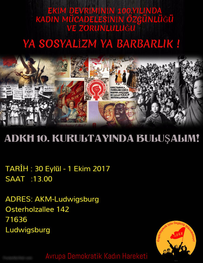 “EKİM DEVRİMİNİN 100.YILINDA KADIN MÜCADELESİNİN ÖZGÜNLÜĞÜ VE ZORUNLULUĞU, YA SOSYALİZM YA BARBARLIK” şiarıyla gerçekleştireceğimiz 10.Kurultayımızda birleşelim, mücadele edelim.