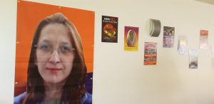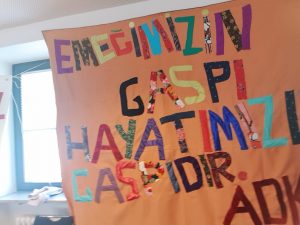 Salonun girişinden başlayan zemine yapıştırılmış,üzerinde enteresan sözlerin bulunduğu; ”Her istek kendine bir yol bulur”,”Kadının direnişi kadına mirastır” ve çocuk ayak izlerinde yazan ”Çekin kirli ellerinizi üzerimizden”…gibi renkli ayak izleri; katılımcıları kadınların pankartına götürüyordu.