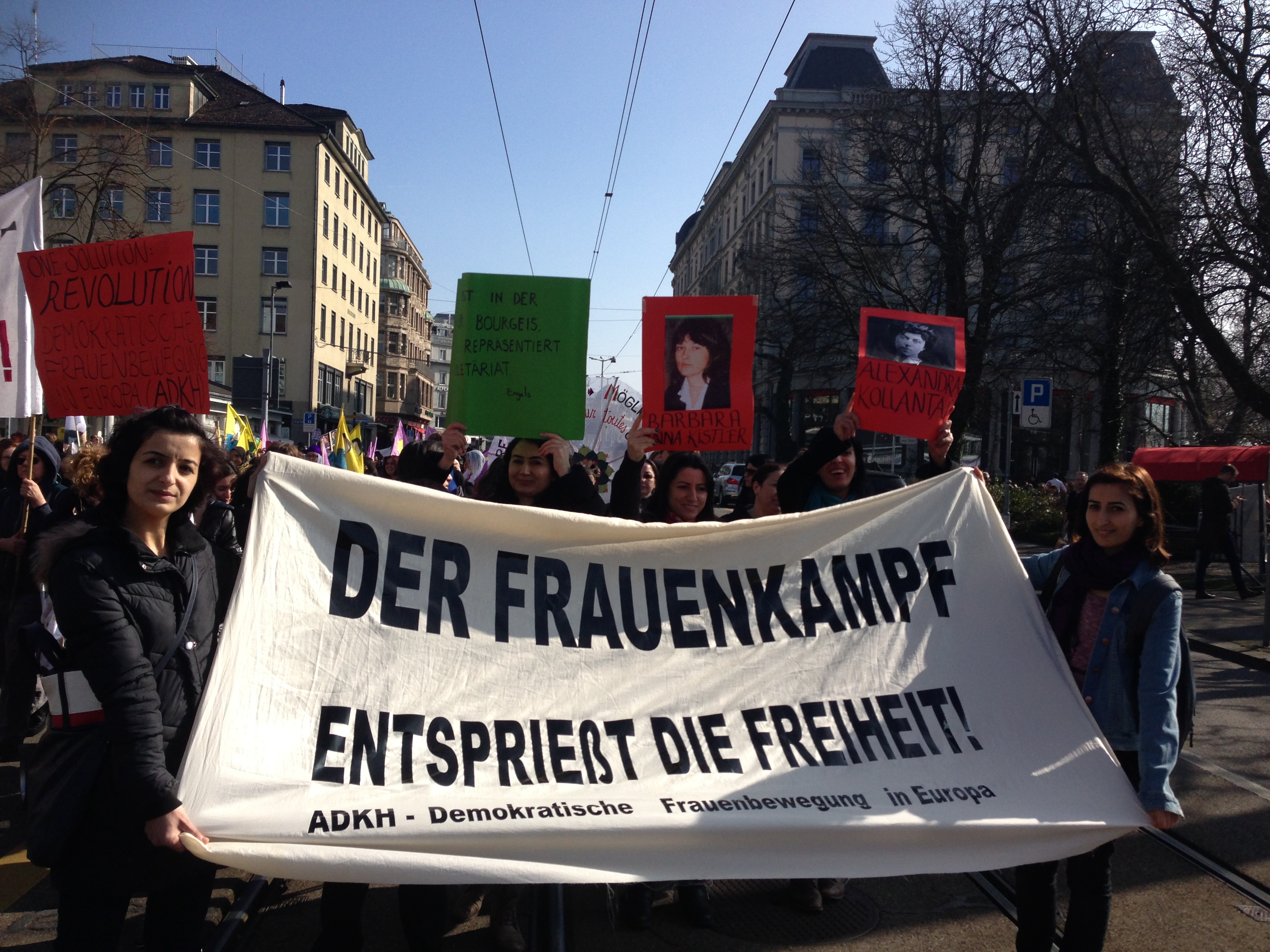 İsviçre’nin Zürich Kantonu’nda, Avrupa Demokratik Kadın Hareketi’nin de bileşeni olduğu, yerli ve göçmen 20’ye yakın kadın örgütü ve kurumundan oluşan “Zürich 8 Mart Komitesi’nin” çağrısıyla 8 Mart Cumartesi günü saat 13:30’da yürüyüş gerçekleştirildi. Zürich Hectplatz’da başlayan yürüyüş programı içersinde Avrupa Demokratik Kadın Hareketi faaliyetçilerinin oynadığı kısa bir sokak tiyatrosu yapıldı. Sokak tiyatrosunda, kadının kendi rengi ve sesiyle, yüzyıllardır süregelen suskunluğunu parçalamanın, örgütlü olmakla dünyayı değiştirmenin mümkün olabileceği dans ve müzik eşliğinde sergilendi.Bu yılki 8 Mart yürüyüşünün ana teması özelde cins sorunu üzerinde şekillense de genel itibariyle kapitalist sisteme karşı beraber mücadele etmenin önemiyle belirlendi.Ayrıca eylem içerisinde Zürich’in büyük alışveriş mağazalarına, özel bankaların duvarlarına kapitalizmi hedef alan yazılamalar yapıldı, pankartlar asıldı.Yürüyüş güzergahı üstünde belli noktalarda durularak, her kurumun kendi bildirisi okunurken çevredeki insanlara, iş yerlerine, kafe ve restoranlara yoğun bildiri dağıtımı yapıldı.Yürüyüşte sık sık “kein Gott, kein Staat, kein patriarchal,” (Tanrı yok, Devlet yok, erkek egemen zihniyete hayır!) sloganı atılırken, Kürtçe ve Türkçe sloganlar da atıldı, Kürtçe müzikler çalınarak halaylar çekildi.2 saat süren 8 Mart yürüyüşü Helvetiaplatz’da bitirildi.