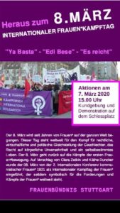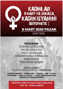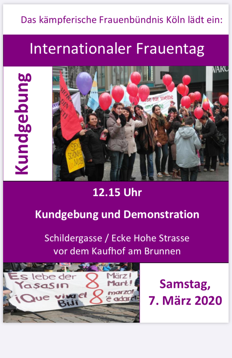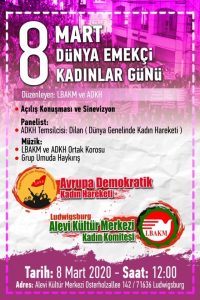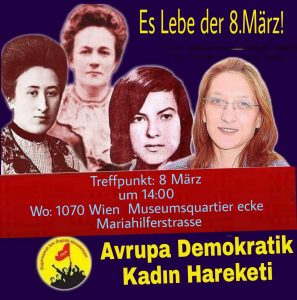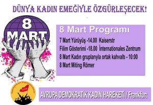 Emekçi kadının mücadele günü 8 Mart tüm dünyada çeşitli etkinliklerle kutlanmaya başlandığı bu günlerde biz de Avrupa Demokratik Kadın Hareketi olarak bir dizi etkinlikler gerçekleştiriyoruz. “Dünya Kadın Emeğiyle Özgürleşecek!” sloganıyla yapılacak tüm etkinliklere katılım çağrısı yapıyoruz. Kadınların kurtuluş mücadelesinin tüm alanlarda yükselterek, sizleri;
