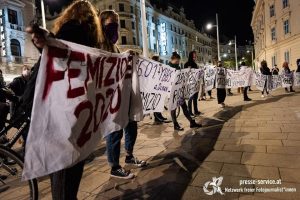 Yapılan basın açıklamasında; “Dünya genelinde, özellikle son yıllarda biz kadın örgütlerinin gündeminden hiç düşmeyen femizid (kadın katliamı), pandemi sürecinde tüm dünyada artarken, başta Viyana olmak üzere, Avusturya’da da ciddi derecede hissedilir bir şekilde artmış bulunuyor. Avusturya genelinde çoğunluğu Viyana’da olmak üzere, Ocak ayından bugüne, dün 19. kızkardeşimiz yine en yakınındaki erkek tarafindan katledildi. Kadınları şiddet uygulayarak, katlederek, terbiye etmeye, hizaya getirmeye, susturmaya, sindırmeye çalışıyorlar. Ancak nafile!.. Tüm saldırılara, katliamlara rağmen korkmuyoruz, susmuyoruz, itaat etmiyoruz… Her katledilen kızkardeşimiz öfkemizi daha da büyütüyor.” denilerek, katledilen 19 kadının isimleri okundu. Diğer kadın kurumlarının da yaptıkları konuşmalardan sonra Museumquartier’e doğru yürüyüşe geçildi ve İnsan Hakları Meydanı’na gelindiğinde atılan sloganlar ve alkIşlarla eylem son buldu.
