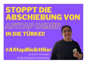 Biz kadınlar dünyada, Almanya’da 8 Mart günü Kadın Grevine hazırlanırken, eşitlik, özgürlük ve şiddete karşı başka bir dünya mümkün derken yanı başımızda bir kadın arkadaşımızın yurtdışı edilmesine sessiz kalmayacağız. Afitap Demir’in Türkiye’ye gönderilmesine izin vermeyeceğiz. Afitap’ın yeri çocuklarının, ailesinin, dostlarının yaşadığı yer Almanya’dır.